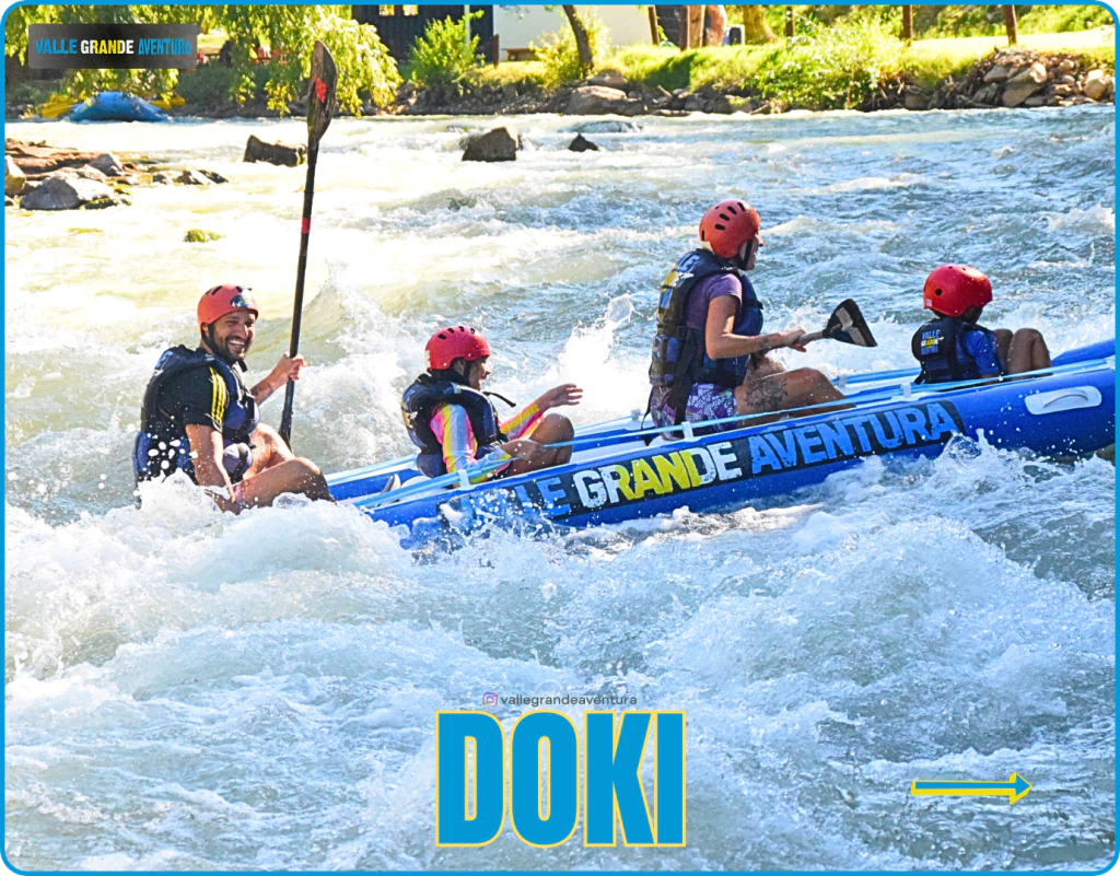 El Doki es una embarcación diseñada para un máximo de 4 ocupantes. Al ser más pequeña y liviana, la balsa reacciona con muchísima más potencia a cada ola y remolino. Es una batalla directa y emocionante contra la corriente del Río Atuel.